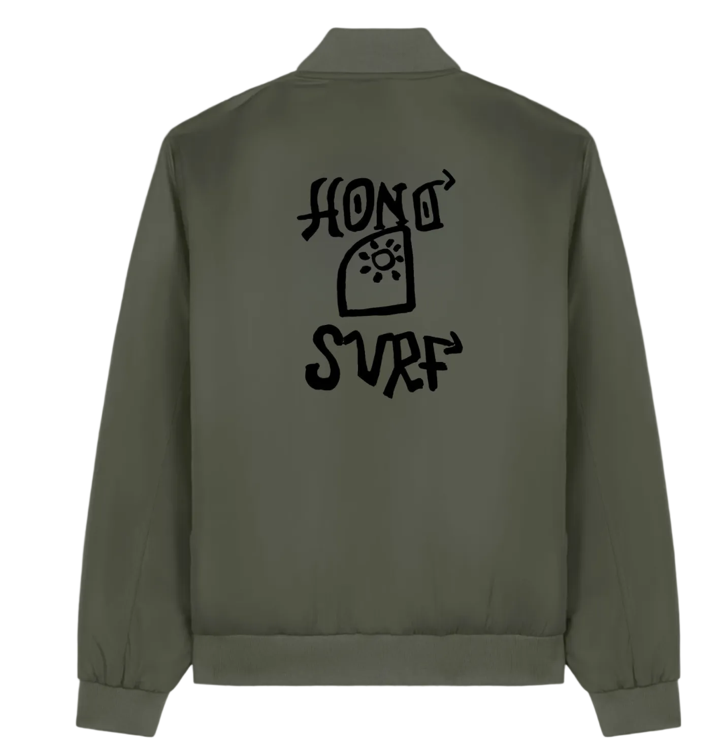 La veste bomber kaki durable Surf HONO – Signature TIKI incarne l’identité forte de la marque. Minimaliste à l’avant et graphique au dos, elle reflète la culture surf : libre, instinctive et engagée.