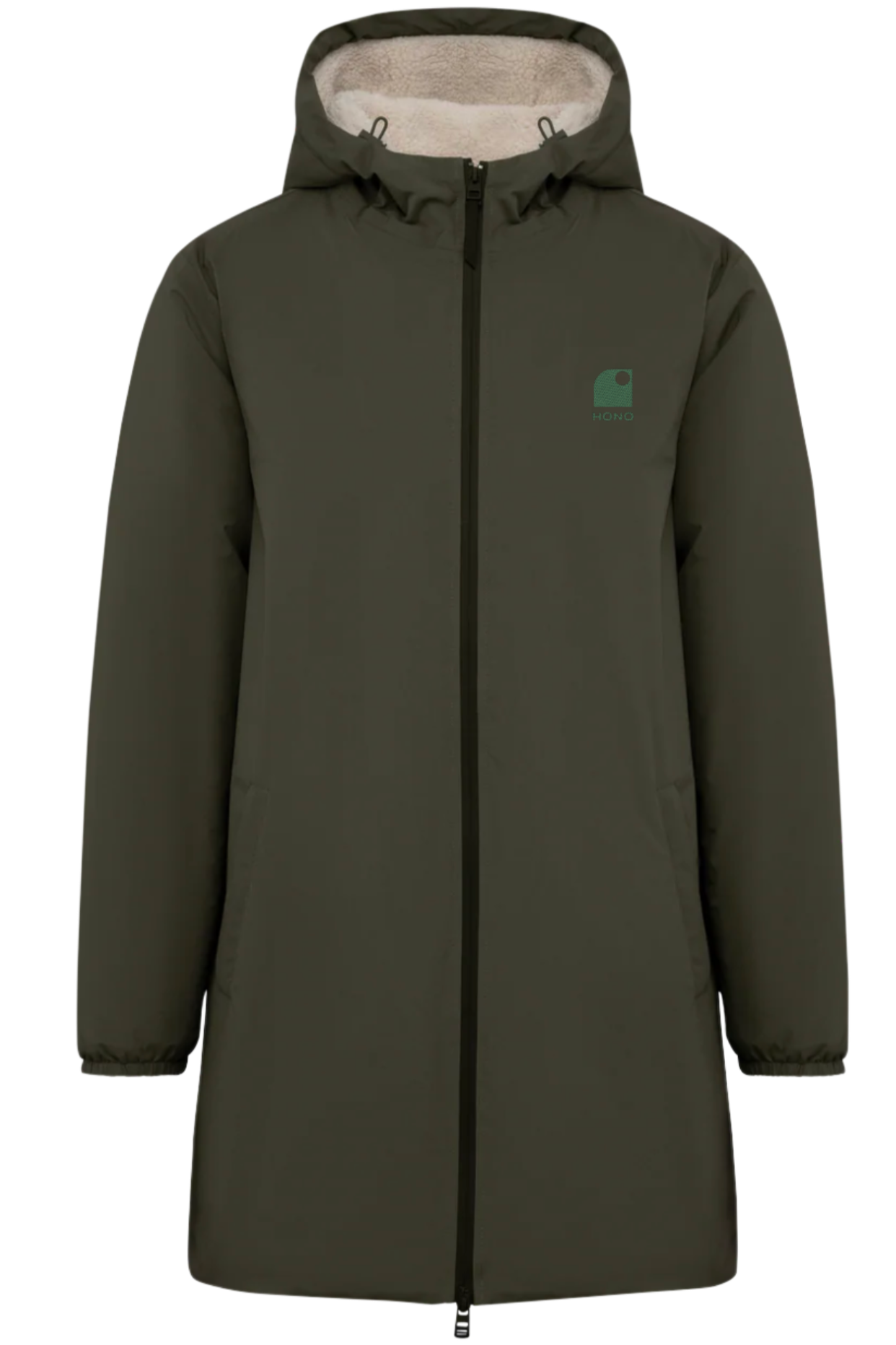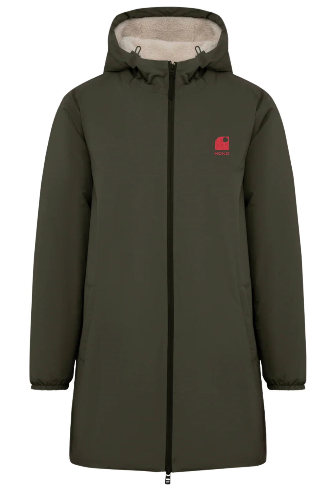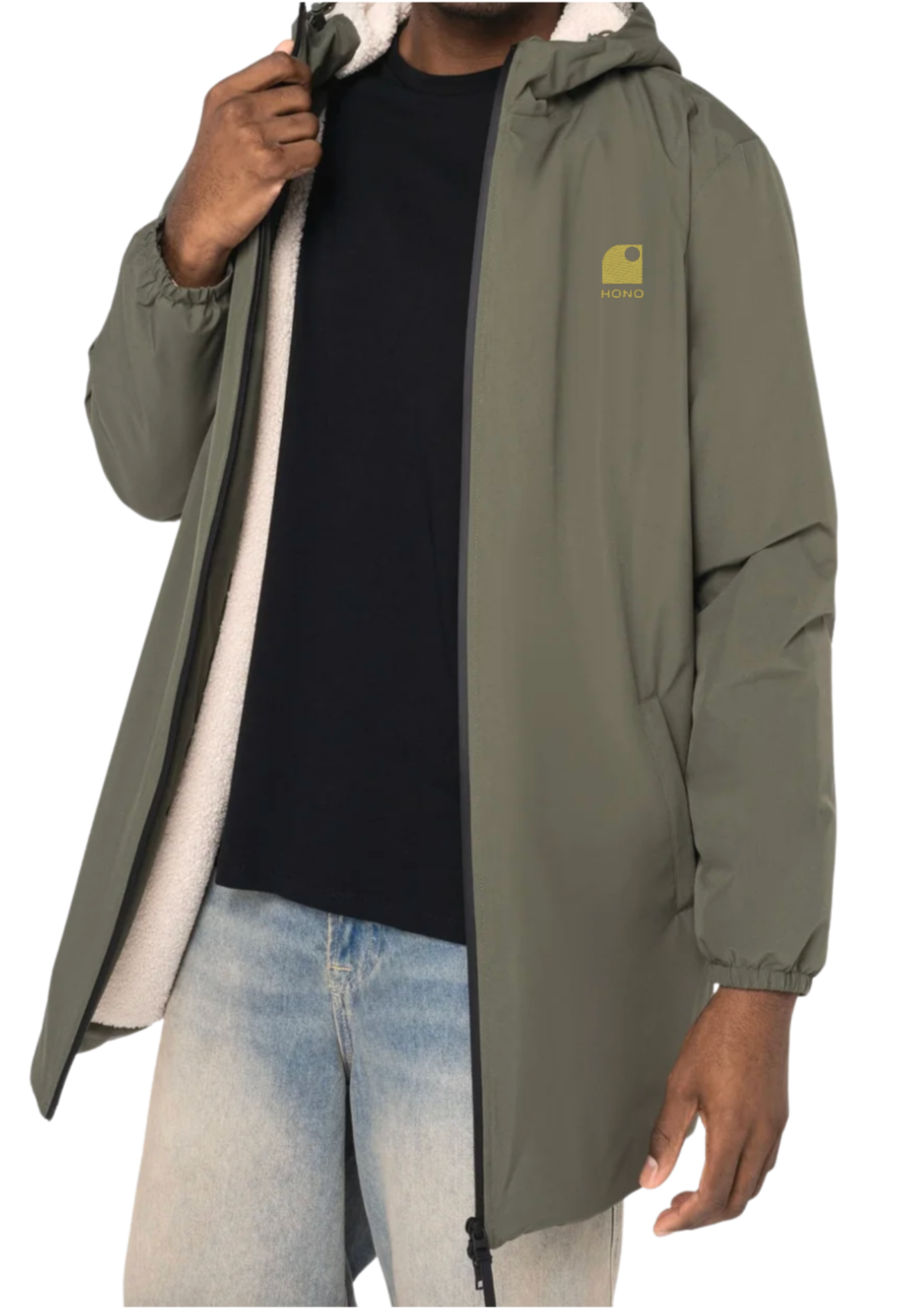 Veste imperméable écoresponsable unisexe HONO, doublée en sherpa recyclé, surfwear durable pour homme et femme.